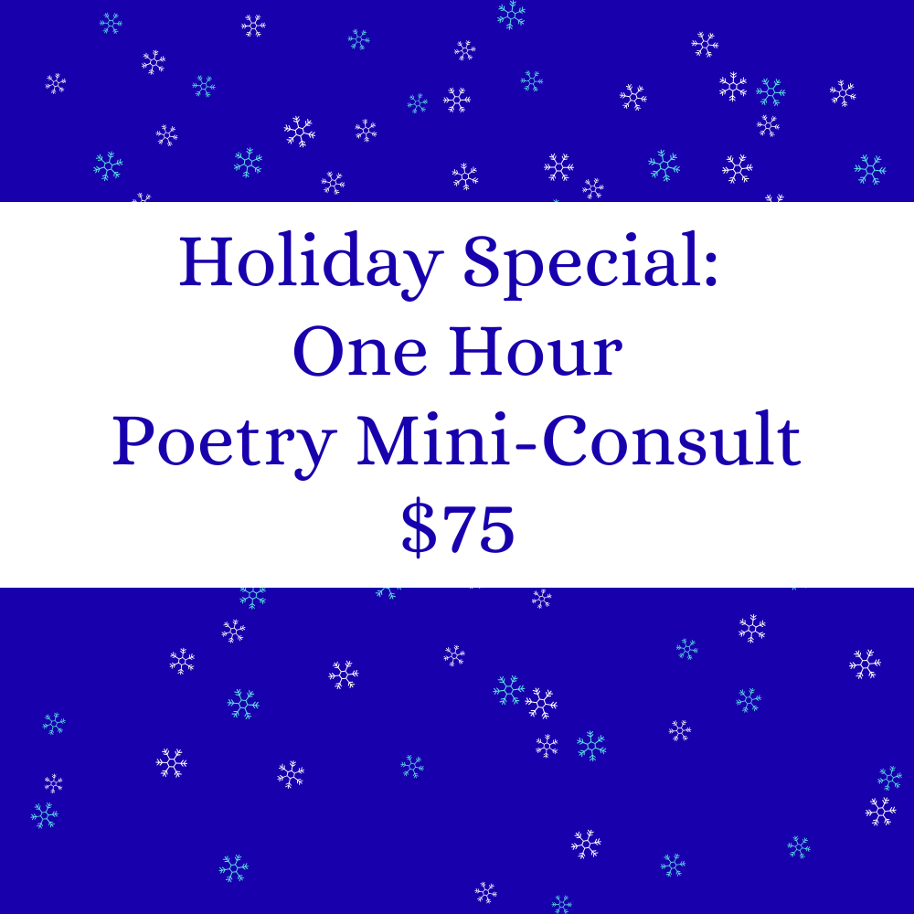 Sessions & Workshops Categories: Select a Category Mini-Consults (Holiday Special) Four-Week Workshops Special Sessions Enweirdening Sessions Creative Burst Sessions Mini-Consults (Holiday Special) | Four-Week Workshops | Special Sessions | Enweirdening Sessions | Creative Burst Sessions | Poetry Mini-Consult, One Hour $75.00 Poetry Mini-Consult, 30 Minutes $50.00 Studio & Craft Gift Card from $25.00 M 12/1 Creative Burst Session (9:00 AM-10:00 AM EST) *FREE* $0.00 A Corner in the Chaos: Keeping Creativity Close During the Holiday Season (T 12/2, 7:00-8:30 PM Eastern) $50.00 M 12/8 Creative Burst Session (8:00-9:00 PM EST--please note later time) *FREE* $0.00 M 12/15 Creative Burst Session (9:00-10:00 AM EST) *FREE* $0.00 M 12/22 Creative Burst Session (7:00-8:00 PM EST) *FREE* $0.00 January Poetry Workshop (Thursdays from 6:30-8:30 PM EST, via Zoom) $350.00 January Enweirdening Session (T 1/6, 7:00-8:30 PM EST) $50.00 February Poetry Workshop (Wednesdays from 6:30-8:30 PM EST, via Zoom) $350.00 3-Pack of Monthly Workshops $975.00